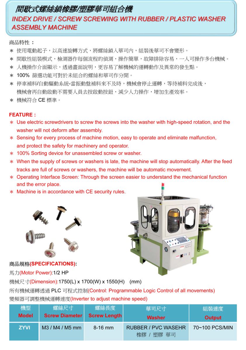 ● 停車補料/自動驅動系統-當振動盤補料來不及時,機械會停止運轉,等待補料完成後,機械會再自動啟動不需要人員去按 啟動按鈕,減少人力操作,增加生產效率。