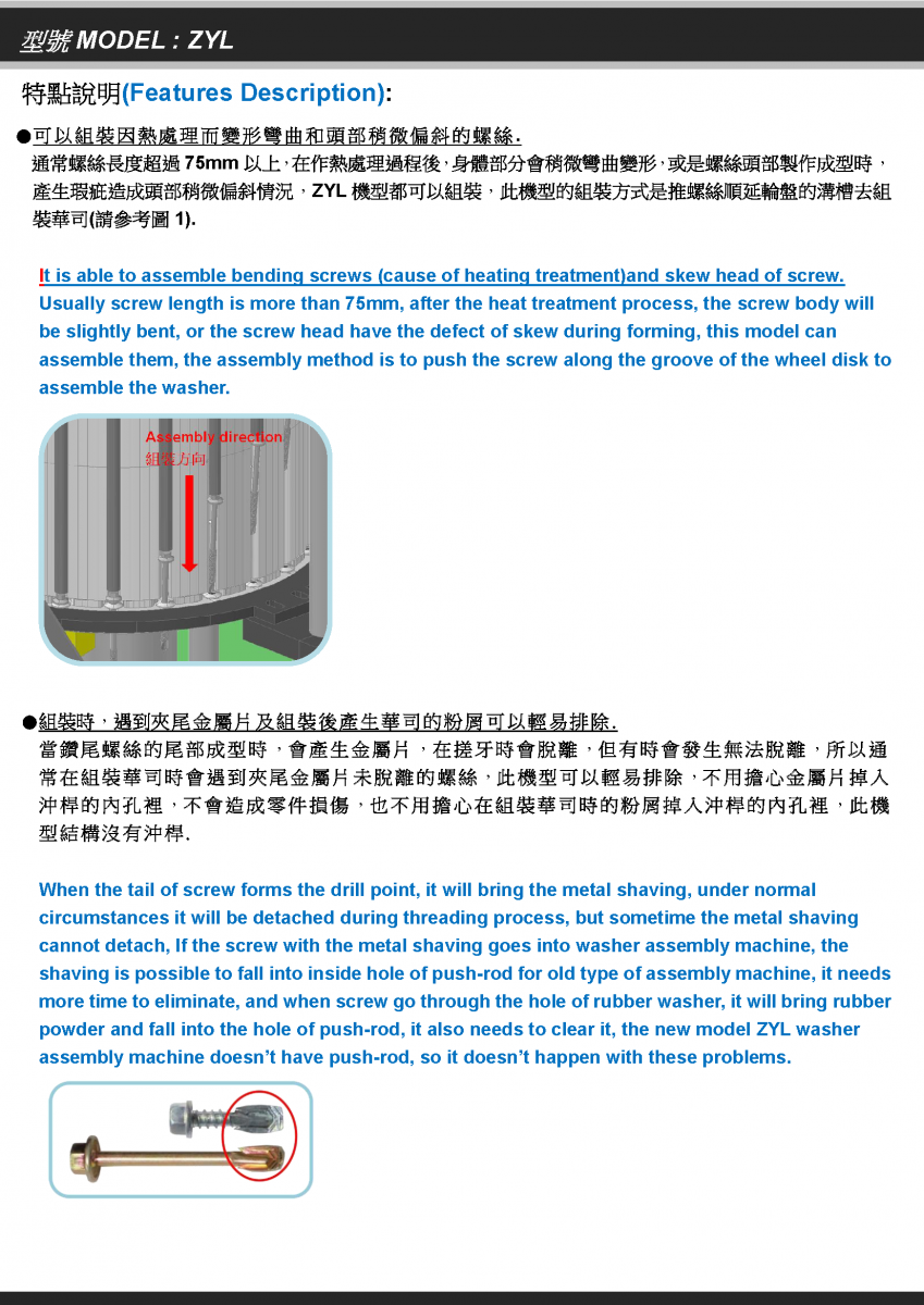 Interchangeable Tooling Design: The mold sets are changeable, allowing for the assembly of various sizes and types of screws and washers.dvanced Assembly Mechanism for Irregular Parts: Specially designed to handle difficult fasteners. It effectively assembles screws with wings and long screws that are bent or deformed due to heat treatment.