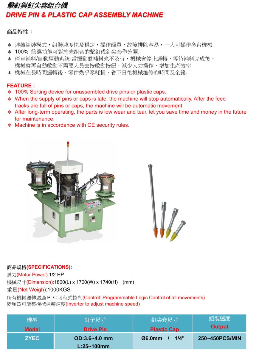 ● 100% Sorting device for unassembled drive pin or plastic cap .
