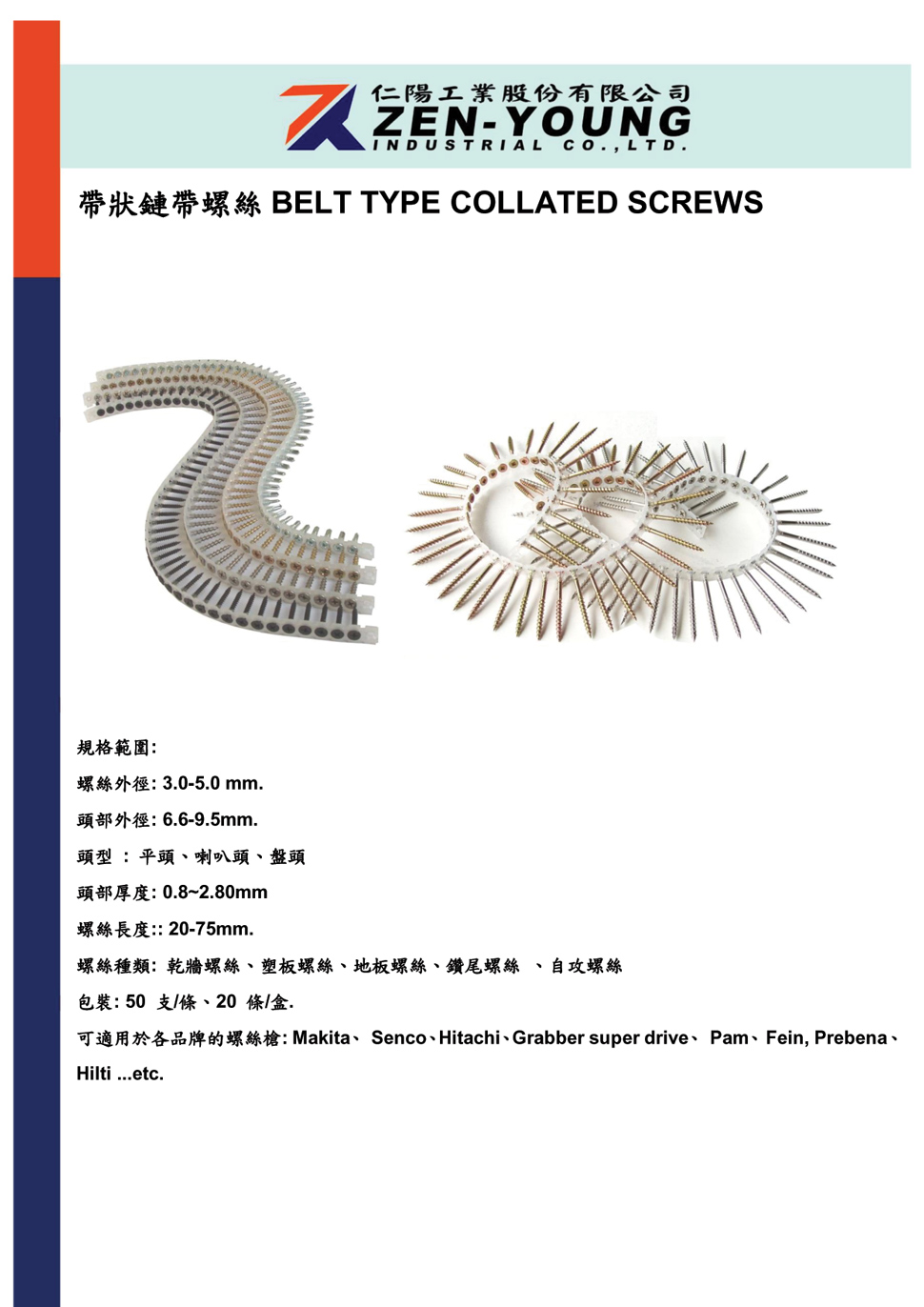 ZEN-YOUNG INDUSTRIAL CO., LTD is a professional manufacturer of collated screws. By utilizing experienced technology for automaton, we developed a high-speed collated screw assembly machine (Output: 2000 pcs/min), also we developed new plastic strips in common use any range of power tools and more smoothly & highly-speed in use. We got patent certificate form many countries.The high productivity equipment and the complete process of quality control enable us to offer you the most competitive price and quality of collated screws.