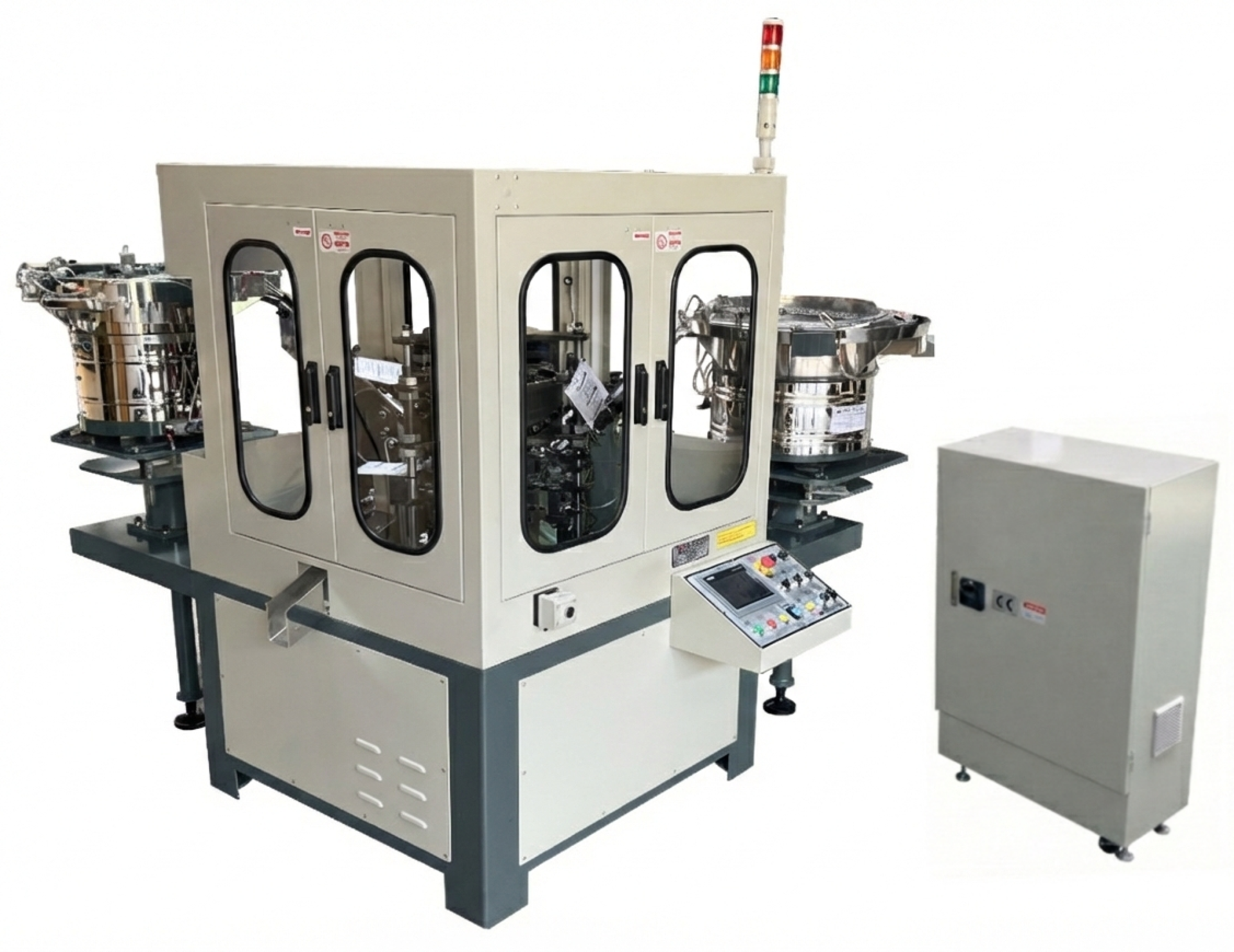 模具可更換設計: 具備高度彈性,可依需求更換模具以組裝多種尺寸及型式的螺絲與華司。高容錯率特殊組裝機構: 專為特殊扣件設計,能順利組裝帶有翅膀 (Winged) 的螺絲,甚至能克服長螺絲因熱處理而產生的微彎曲或變形,順暢組裝不卡機。